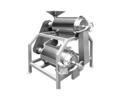 电机由皮带驱动,使安装在花键上的刮板高速旋转。当破碎的水果通过进料口进入机器时,接浆盘将物料均匀地卸到刮板和筛网上。由于刮板的旋转作用和导程角的存在,物料沿滚筒向出料端运动,运动轨迹呈螺旋状。在刮板和筛筒之间的运动过程中,物料被离心力压碎。果汁和肉(浆)从筛孔送入下道工序,皮和籽从渣斗排出,达到自动分离的目的。只要更换不同规格的筛网,调整刮板的导程角,就可以改变打浆速度,获得满意的打浆效果;